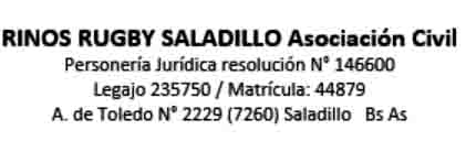 De conformidad con lo aprobado por la Comisión Directiva en su reunión del día 15 de febrero de 2023 y a lo dispuesto en los artículos 28° y 30° del Estatuto, se convoca a los Señores Socios de RINOS RUGBY SALADILLO Asociación Civil (en primera y segunda convocatoria) a la Asamblea General Ordinaria a celebrarse el día 29 de marzo de 2023 a las 21 hs. en el quincho del campo de rugby, sito en Juan Manuel de Rosas entre Int. Alejandro Armendáriz y Carlos Arrospide, Saladillo, Bs. As. para considerar y resolver sobre los asuntos incluídos en el siguiente
