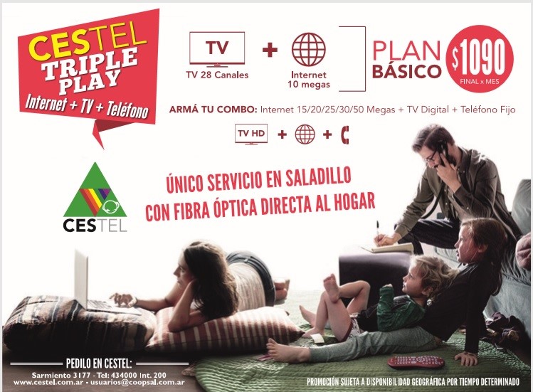 Mediante el tendido de la red de fibra óptica CESTEL está lanzando el servicio Fibra Óptica al Hogar en una nueva amplia zona, con diferentes propuestas de ancho de banda y una promoción de lanzamiento desde 10 Megas, con 28 Canales de TV a solo 1090 pesos mensuales y con 60 canales con un abono de 1560 pesos finales por mes.