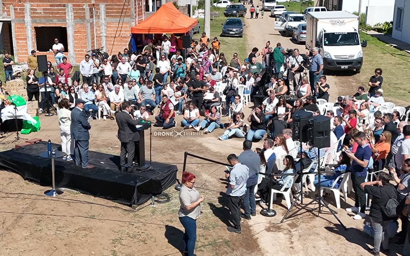 El acto de entrega se llevó a cabo por la tarde y el gobernador estuvo acompañado por ministros y funcionarios de su gabinete. El mandatario fue recibido por el intendente José Luis Salomón, con quien encabezó el acto, acompañados por autoridades municipales, concejales, consejeros escolares, dirigentes políticos, beneficiarios y vecinos.
