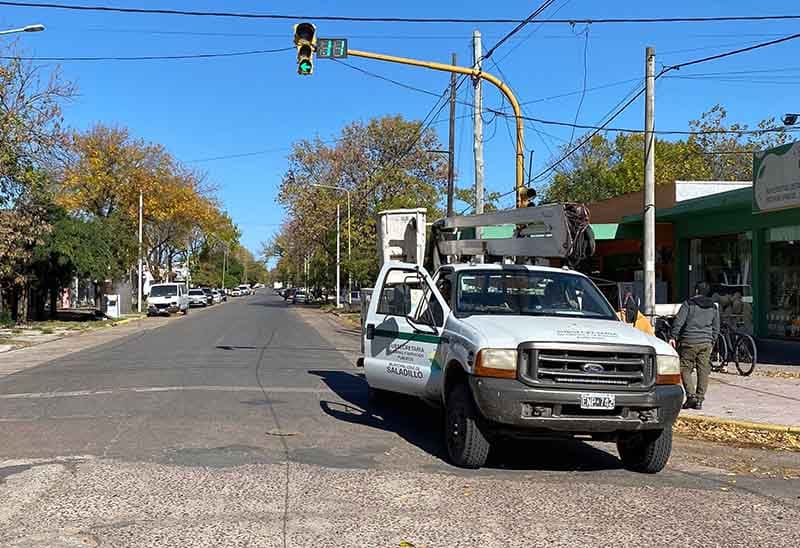 Durante la jornada de ayer en el cruce de las avenidas Cabral y Rivadavia, operarios de la Municipalidad de Saladillo llevaron a cabo trabajos de reparación de un segmento del tendido eléctrico que sufrió roturas en la última tormenta fuerte que se vivió en la ciudad.